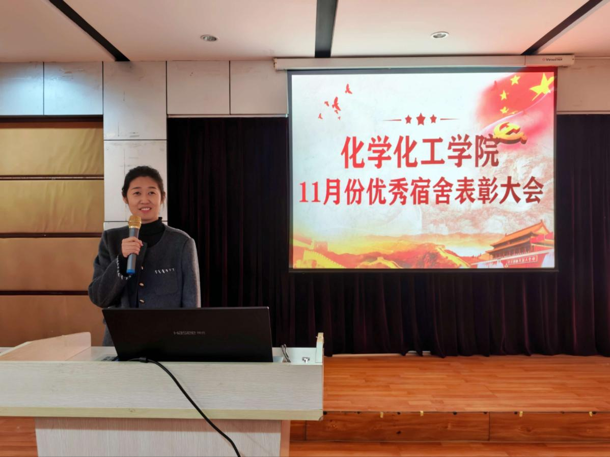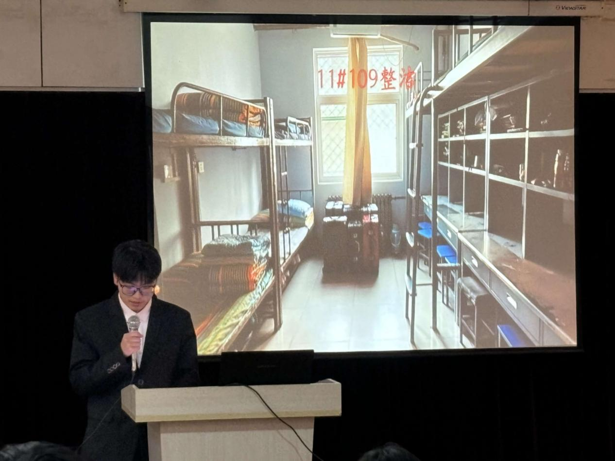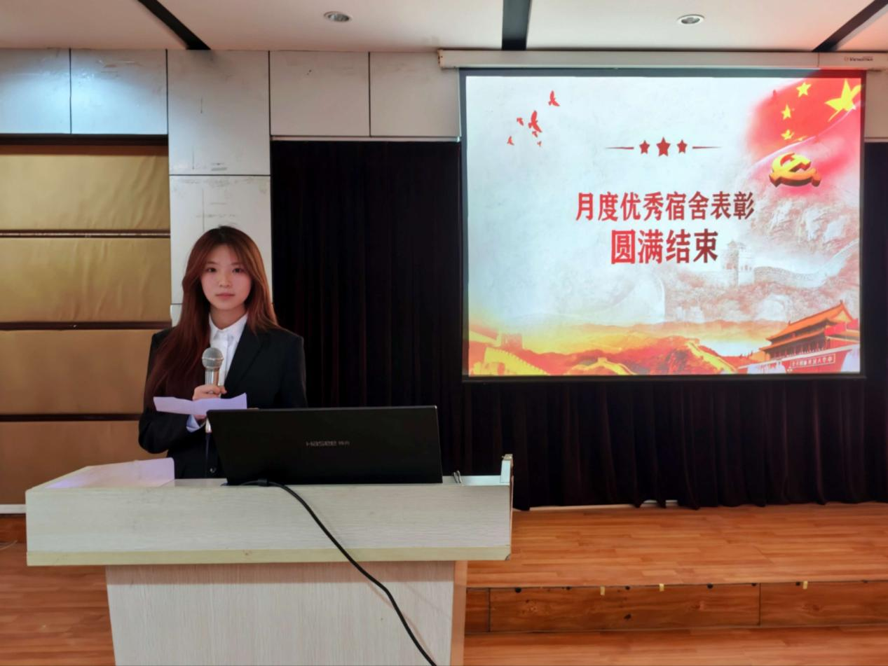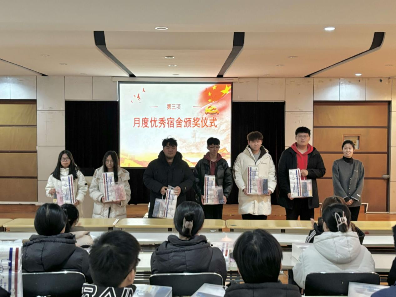 会上,主持人宣读了11月份优秀宿舍名单,并邀请优秀宿舍代表上台分享经验。他们主要从日常卫生打扫、物品整理收纳、舍友间协作沟通等多个角度,详细介绍了保持宿舍整洁卫生的有效方法与心得。公寓负责人为优秀宿舍颁发奖品,并对大家付出的努力给予充分肯定。她指出,优秀宿舍的评选不仅是对宿舍卫生状况的一次肯定,更是对同学们自我管理、团队协作以及责任感培养的一次重要实践。这些宿舍所展现出的不仅是干净整洁的生活环境,更是一种积极向上的生活态度。她鼓励其他宿舍以优秀宿舍为榜样,提高宿舍管理水平,提升宿舍文化内涵,共同营造良好的宿舍氛围。最后,她再次对获奖宿舍表示热烈的祝贺,希望大家能够继续保持这种良好的势头,不断追求卓越,为全院同学树立榜样。