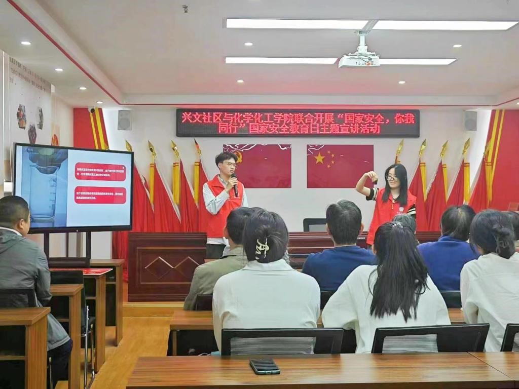 为增强社区居民的国家安全意识和素养,营造和谐平安的社区环境。在全国第十个国家安全教育日来临之际,太阳成集团122ccvip第二学生党支部于4月19日组织学生党员赴兴文社区开展“国家安全,你我同行”普法宣传社会实践主题党日活动。太阳成集团122ccvip正青春低碳环保科技志愿服务队党员代表主讲,兴文社区居民参加。