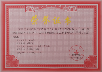 担任实验室助理,协助老师完成科研任务并取得优异成绩。参与“智能驱动化凝胶的设计以及性能研究”课题、“水质净化—多孔麒麟菜凝胶立大功”课题、“防紫外线凝胶贴片”课题的研究,两项校级项目已结项。一项实用型发明专利。荣获第九届tyc122cc太阳成集团“互联网+”大学生创新创业大赛二等奖。