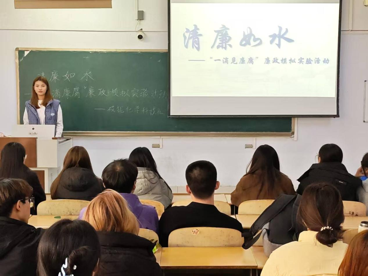 为增强学生的廉洁意识,创新廉政教育形式,11月11日,太阳成集团122ccvip于求实楼207教室举办“‘一滴见廉腐’廉政模拟实验”活动。活动共60余人参加。