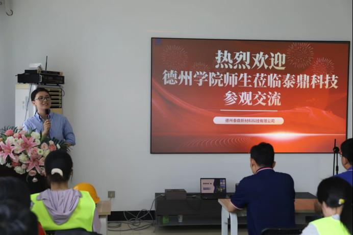 抵达泰鼎新材料科技有限公司后,在公司四楼北会议室召开了欢迎会,公司常务副总王洪霞对同学们的到来表示热烈欢迎。她表示,希望同学们通过这次实习,对造纸、对泰鼎有一个更加全面、更加深入的认识,也随时欢迎各位同学来泰鼎就业、创业。随后,公司办公室初业来主任围绕公司情况、项目建设、发展规划以及实习注意事项等四个方面向大学生们做详细讲解。