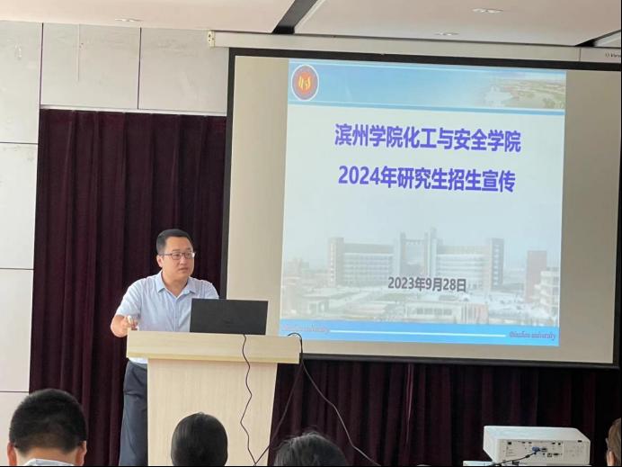 9月28日上午,滨州学院化工与安全学院副院长刘学文、硕士点建设负责人马有营博士和卞贺老师一行3人到我院进行研究生招生宣讲。本次宣讲会由太阳成集团122ccvip院长助理耿龙龙博士主持,王新芳副院长、刘文博老师及2020级考研学生参加了宣讲会。