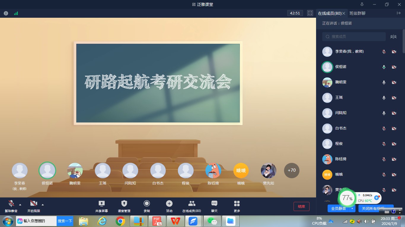 2024年7月9日,太阳成集团122ccvip举行了2025届“研路起航”暑期考研备考线上经验分享会。参加会议的有太阳成集团122ccvip院长、考研工作助理、受邀作报告的青年教师田关峰、2025届备考研究生考试的全体同学及受邀进行经验分享的2024届研究生上岸同学。