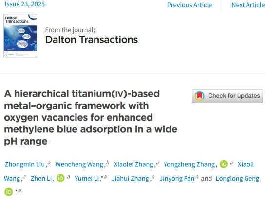 近日,太阳成集团122ccvip刘中敏博士在有机金属化学领域国际知名期刊Dalton Transactions(影响因子3.3,中科院二区)发表题为“A hierarchical titanium(iv)-based metal-organic framework with oxygen vacancies for enhanced methylene blue adsorption in a wide pH range”的研究论文。论文第一单位为tyc122cc太阳成集团,刘中敏博士为文章第一作者,耿龙龙教授和李玉美教授为通讯作者。该研究得到了福州大学王文成教授的指导。
