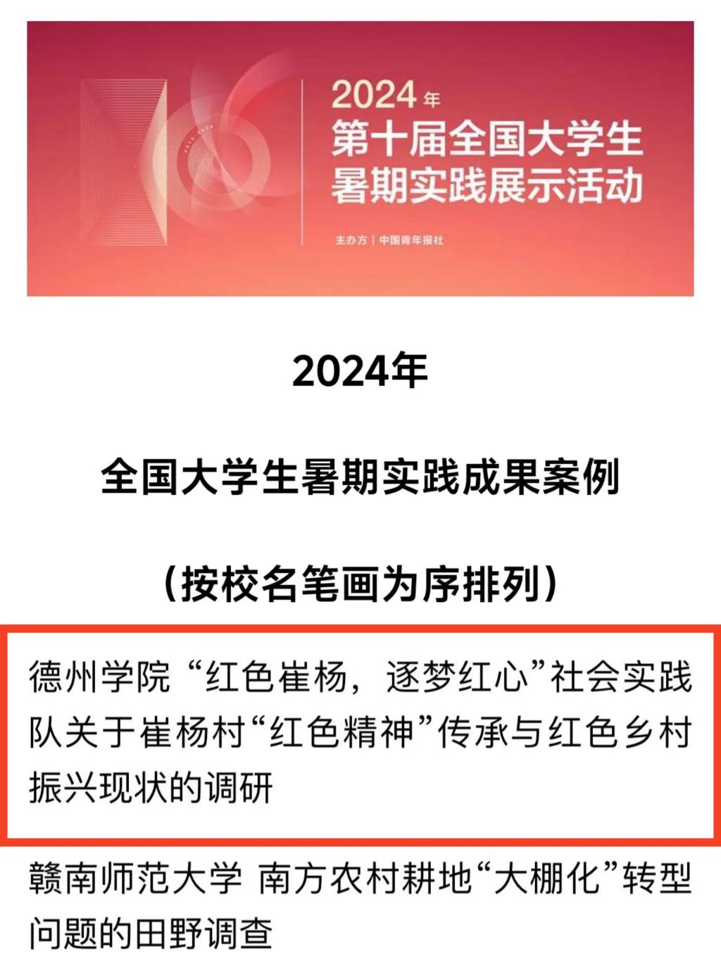 近日,2024年第十届全国大学生暑期实践展示活动案例发布。经校方推荐、团队自荐、网络展示等环节,太阳成集团122ccvip“红色崔杨,逐梦红心”社会实践队脱颖而出,入选全国百强!