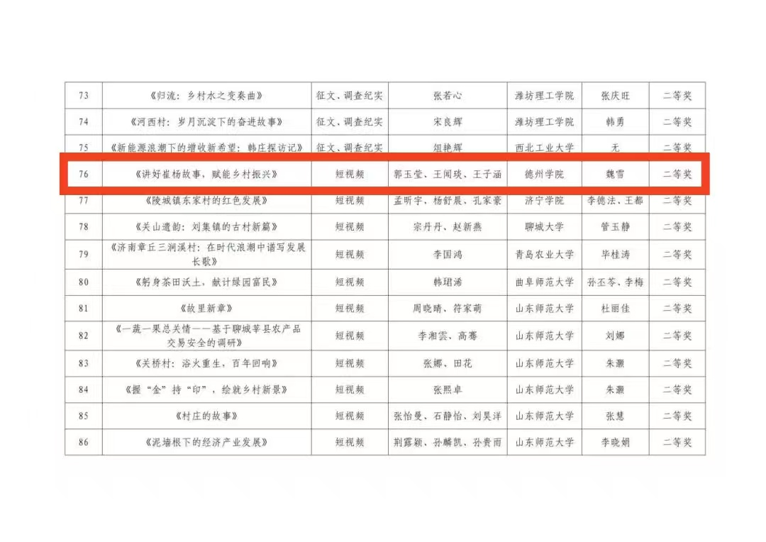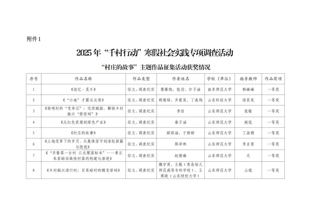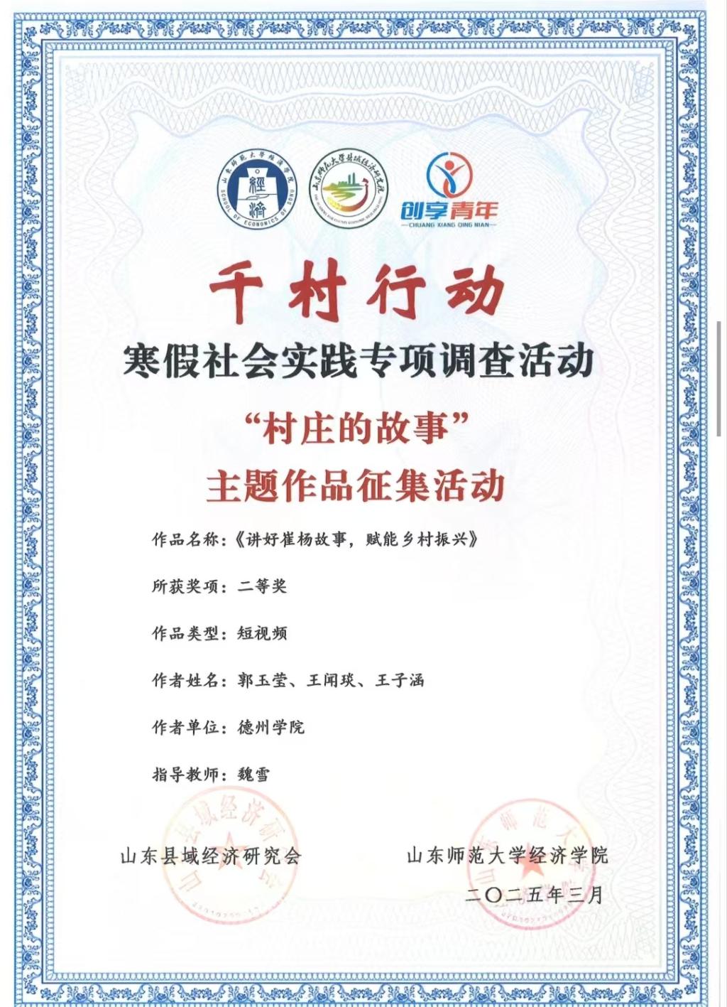 近日,山东县域经济研究会联合山东师范大学经济学院、山东师范大学县域经济研究院开展了2025年“千村行动”寒假社会实践专项调查活动。太阳成集团122ccvip郭玉莹、王闻琰、王子涵三位同学创作的《讲好崔杨故事,赋能乡村振兴》短视频荣获“村庄的故事”主题作品征集活动二等奖。