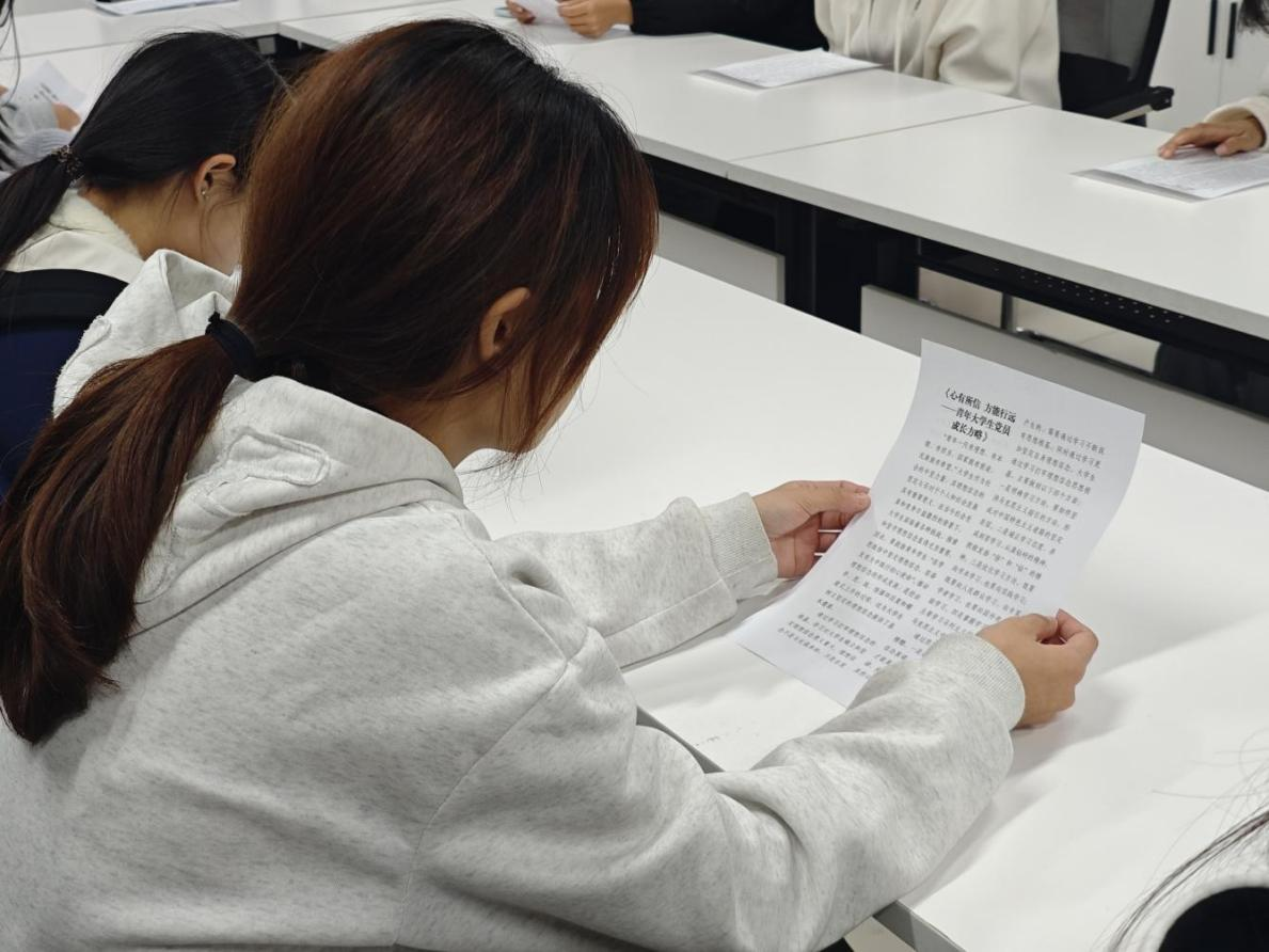 随后,活动进入分组研读环节,各小组围绕《心有所信 方能行远——青年大学生党员成长方略》中的精选片段进行了深入学习和思考。在交流分享环节中,同学们踊跃发言,结合自身学习、生活实际,聚焦“修心”关键词,在朋辈间分享阅读感悟,在真诚交流中深化了对理想信念与心理韧性的理解。最后,主持人对活动进行总结升华,呼吁大家做内心强大的“追光者”,凝聚奋进新时代的青春力量。