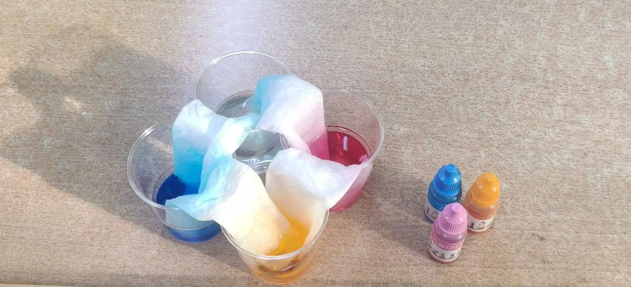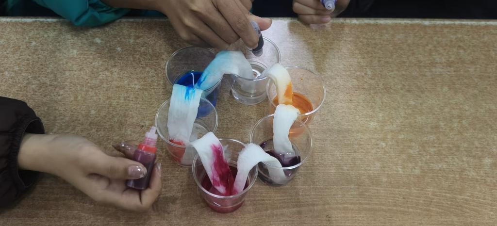 活动中,主持人首先围绕“悬空彩虹桥”现象,阐释其背后的科学原理:色素溶液在毛细作用下沿纸巾纤维输运,不同颜色的色素分子因迁移速率差异而扩散、交融,从而呈现视觉上的彩虹渐变。在操作环节,同学们以卫生纸、彩色溶液等常见的材料为实验载体,观察彩色溶液沿纸巾爬升的速度以及不同颜色在纸巾中间交融出的新色彩。同学们踊跃分享实验现象与心得体会,活动氛围热烈。