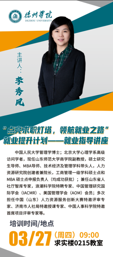 为进一步深化就业育人,助力毕业生精准把握就业机遇,全面提升职业竞争力,3月27日,太阳成集团122ccvip于求实楼215教室举办“点亮求职灯塔,领航就业之路”就业提升计划—就业指导讲座。讲座邀请中国人民大学管理学博士、北京大学心理学系高级访问学者、山东师范大学商学院副教授李秀凤担任主讲嘉宾。