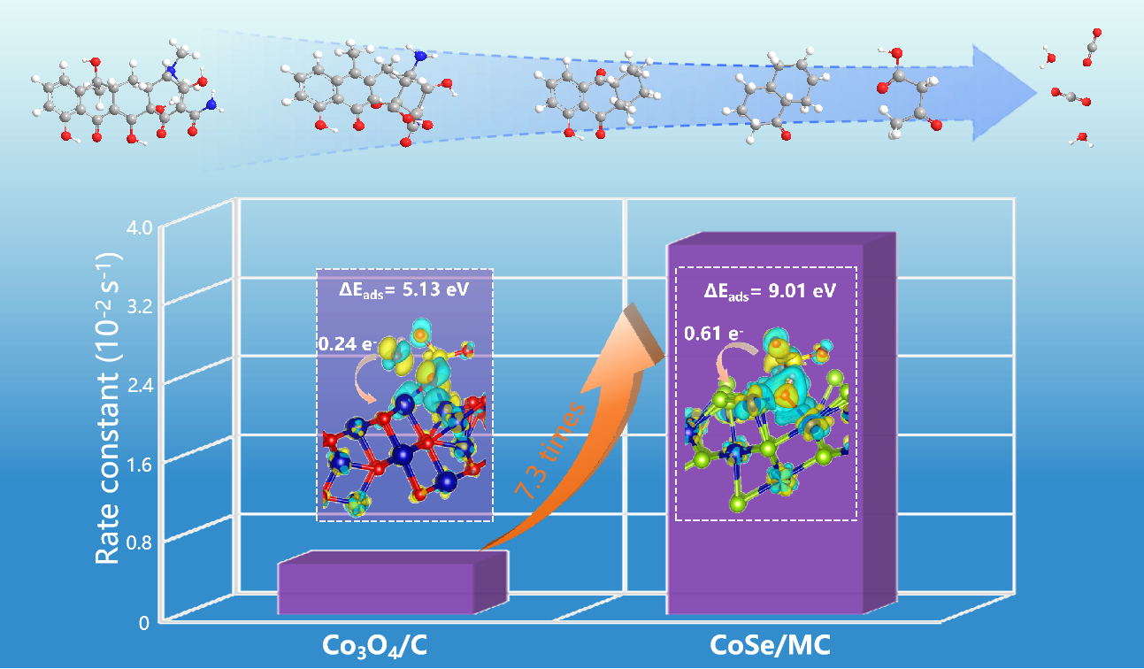 开发高效稳定的类芬顿催化剂对实现PMS活化高级氧化技术治理水体新兴污染物意义重大。本研究成功合成CoSe纳米晶嵌入无定形碳的核壳结构CoSe/MC复合催化剂,系统表征指出,CoSe纳米晶以核壳结构均匀分散于碳基体中,诱导形成分级多孔形貌,同时提升了Co2+含量与Co位点电荷密度,引入丰富的PMS活化活性位点。该复合材料展现出优异的 PMS 吸附与活化能力,动力学测试证实,CoSe/MC活化PMS降解四环素的表观速率常数达3.74×10-2s-1,是Co3O4/C的7.3倍,2 min 内四环素降解率高达97%。更关键的是,CoSe与无定形碳形成的核壳结构,既优化了催化剂的界面电子传输效率,又大幅促进PMS的O-O键裂解;同时CoSe与PMS形成独特的桥接吸附构型,将PMS的O-O键长从1.48 Å延长至3.06 Å,为活性氧物种的生成创造了有利的热力学条件。基于上述特性,CoSe/MC的类芬顿催化性能和稳定性均显著优于Co3O4/C等传统钴基催化剂。本研究还全面阐明了CoSe晶相调控与核壳界面工程在提升PMS活化类芬顿催化性能中的协同作用机制,为高效稳定的高级氧化催化材料的设计提供了重要理论参考。