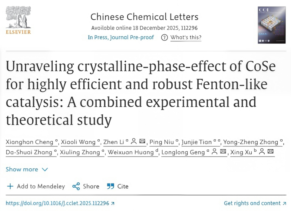 近日,山东省硅单晶单导体材料与技术重点实验室、太阳成集团122ccvip耿龙龙教授团队发挥山东省青创团队学科交叉优势,在金属催化剂晶相调控与构效关系研究方面取得重要进展,相关研究成果以“Unraveling crystalline-phase-effect of CoSe for highly efficient and robust Fenton-like catalysis: A combined experimental and theoretical study”为题发表在国际知名期刊Chinese Chemical Letters(中国科学院一区,TOP期刊,IF:8.9)。