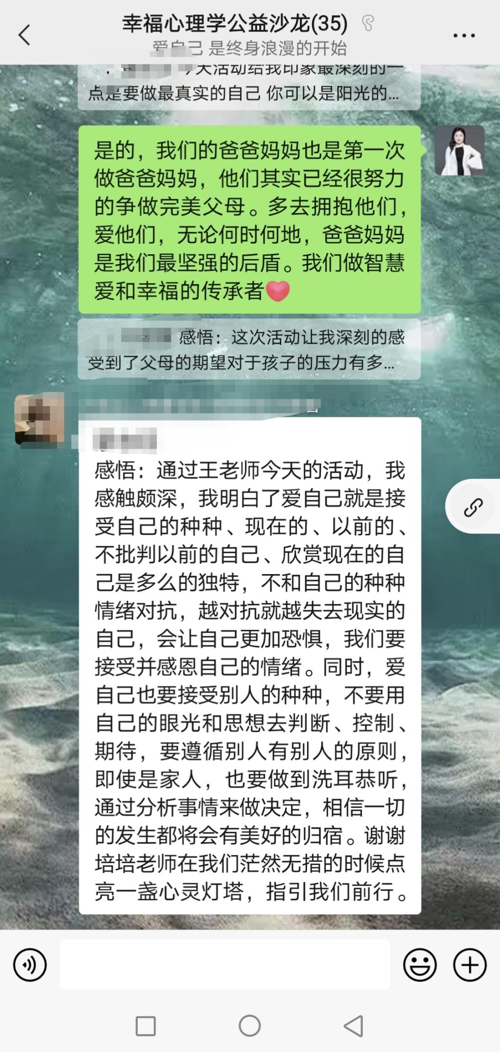 团体成员一一分享参加此次活动的感想和收获。大家纷纷表示,通过本次心理沙龙,爱上了心理学,更加客观认知自己,做真实、完整且有力量的自己,未来活成一道光,照亮更多人。