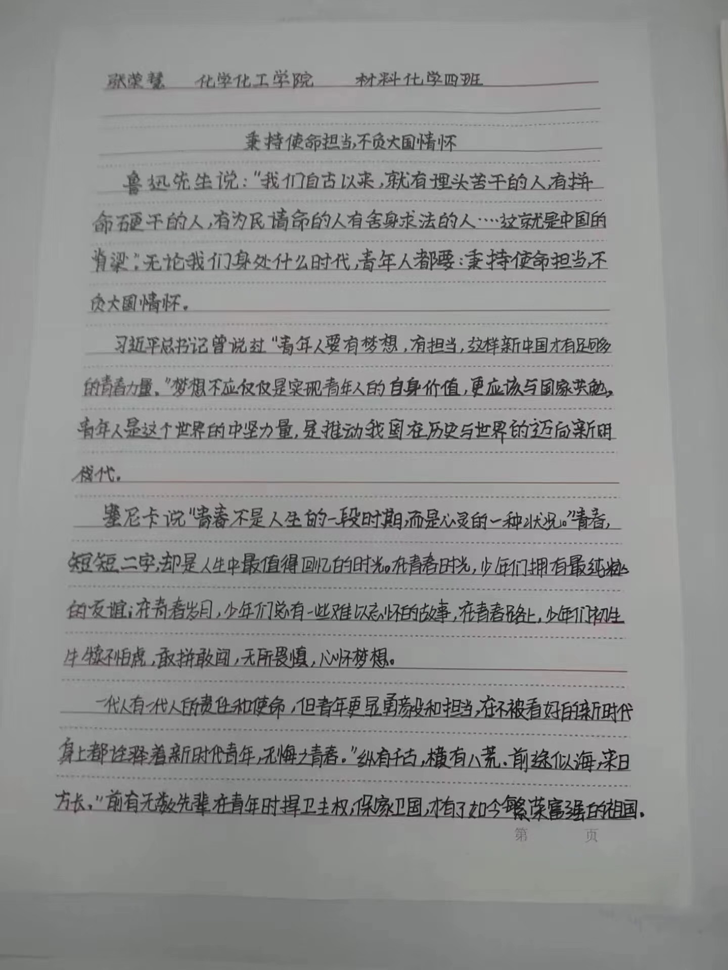 本次活动共收集征文作品37份。同学们在征文活动中,或惊叹于党的辉煌成就,或表达自己践行建功新时代的决心。“稳舵定锚行致远,奋楫扬帆谱新篇。”他们书写了豪情壮志,明确了奋斗目标,展现出青春向上的力量。正如征文中所写“使命呼唤担当,梦想照亮未来,秉持使命担当,不负大国情怀 ”。大家以笔为剑,以墨为锋,以字为刃书写出了祖国的美好未来,展现了新时代 青年学生的昂扬风采。