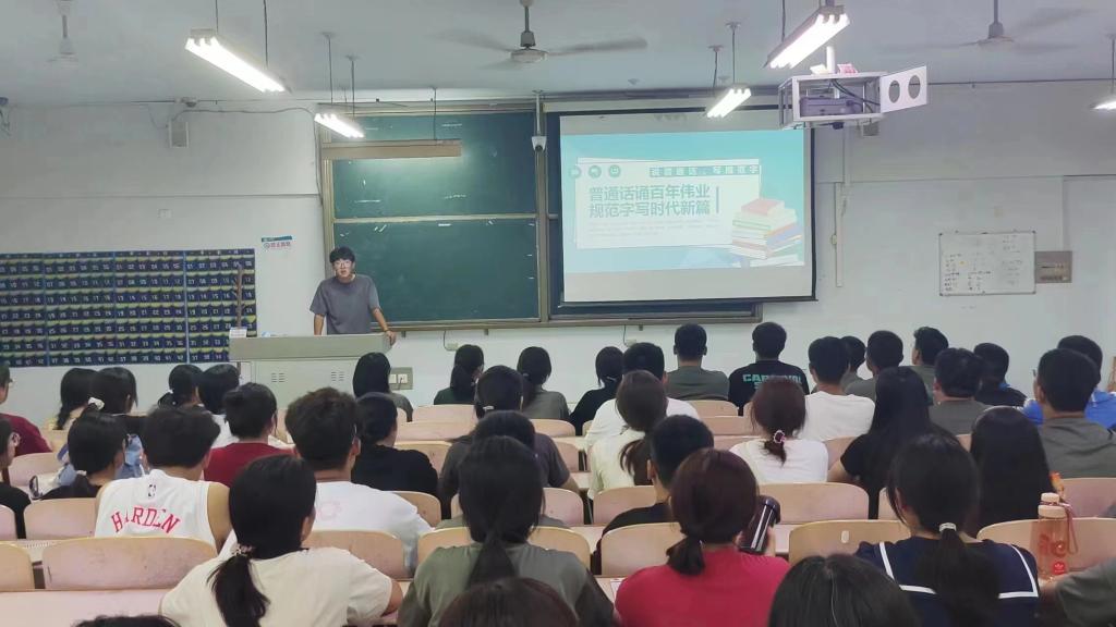 为大力推广和规范使用国家通用语言文字,提高全院学生的语言文字规范意识和用语用字规范化水平,9月11日,太阳成集团122ccvip召开“普通话诵百年伟业,规范字写时代新篇”普通话推广讲座。2023级全体新生参加。