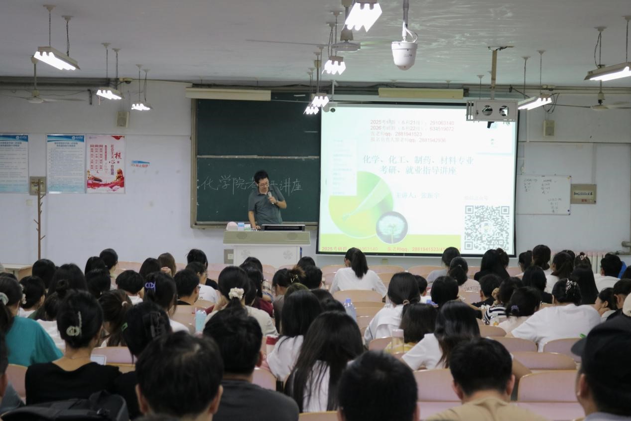 张老师就考研目的、考研优势、专业方向的选择和考试科目等与考研密切相关的信息作了细致讲解,并结合自身多年来从事教学工作、指导学生的经验,向同学们就考研注意事项、报考专业、导师的选择等进行了指导。他表示,同学们要正视考研,合理定位,选择报考适合自己的院校,增强考研信心。同时,为同学们详细介绍了考研的报考流程以及注意事项,并分析了近年来化学化工报考发展新趋势,并重点解读了化学、化工、材料等考研热门专业及院校选择。