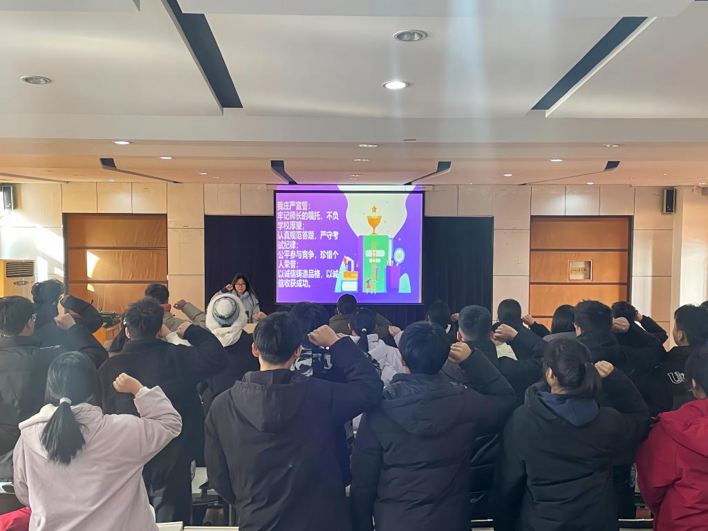 会上,辅导员组织全体学生重点学习了《中华人民共和国刑法修正案(九)》《tyc122cc太阳成集团关于加强学风建设的十项规定》《tyc122cc太阳成集团学生违纪处分条例》《tyc122cc太阳成集团学生管理规定》等文件中关于考试违纪处分的相关内容,结合典型警示案例,讲述了考试作弊的危害性和严重性,呼吁全体同学树立诚信意识,杜绝考试作弊行为,认真复习备考,以优异成绩为本学期画上圆满的句号。会后,全体学生进行诚信考试的宣誓,并签署了《诚信考试倡议书》,誓以自身严正营造良好考风。