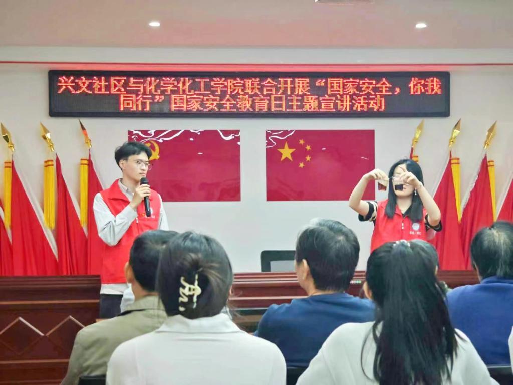 为增强社区居民的国家安全意识和素养,营造和谐平安的社区环境。在全国第十个国家安全教育日来临之际,太阳成集团122ccvip志愿者赴兴文社区开展“国家安全,你我同行”普法宣传活动。太阳成集团122ccvip正青春低碳环保科技志愿服务队队员主讲,兴文社区居民参加。