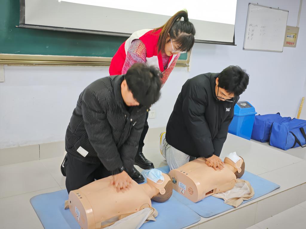 此次培训采取理论讲解和分组实操练习结合的方式进行。专业人员以“黄金四分钟”为切入点,强调了掌握应急救护技能的重要性,并用专业的理论知识和典型的实际案例,向同学们重点讲解了海姆立克急救法、心肺复苏术CPR、人工呼吸以及AED体外除颤仪等急救知识,并利用模拟道具,现场演示心肺复苏的正确操作流程,包括胸部按压的位置、频率、深度以及人工呼吸的配合等关键要点。在现场模拟练习环节,同学们纷纷踊跃参与实践操作,在专业人员的耐心指导下,认真地在模拟人体上进行练习,逐渐熟练掌握了心肺复苏的操作技巧。同时,对于海姆立克急救法针对不同人群的实施步骤,以及伤口包扎的各种方法,如环形包扎、螺旋包扎等,大家也都在实践中得到了充分的学习与锻炼。