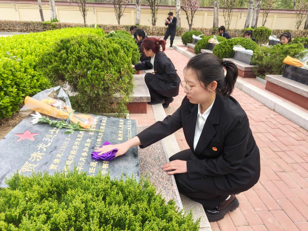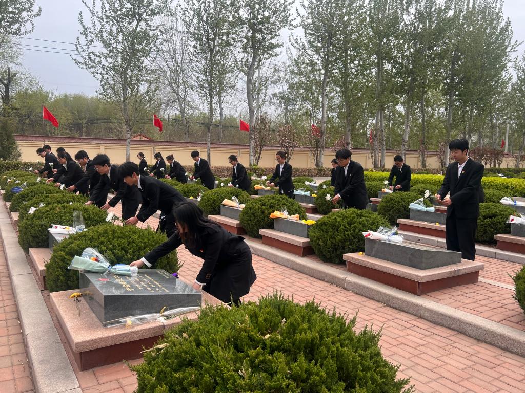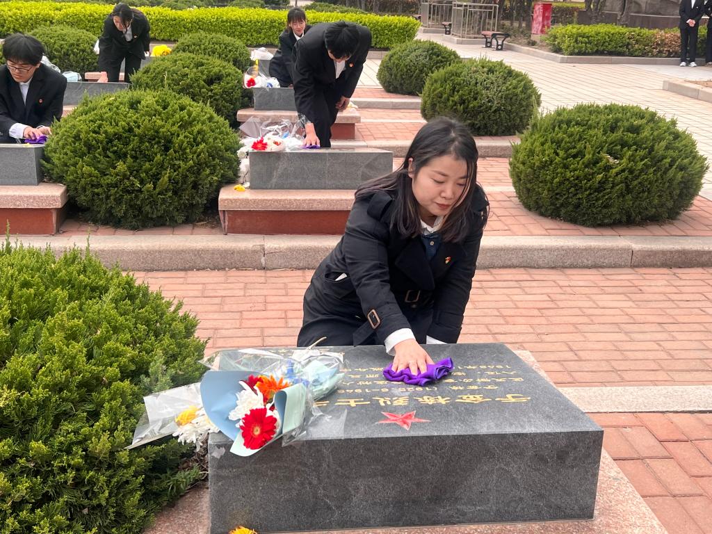 党员代表首先向人民英雄纪念碑敬献花篮。面对着庄严肃穆的革命烈士纪念碑,全体师生向革命烈士默哀致敬,表达对革命烈士的深切哀思之情。师生们面向鲜红的党旗,重温入党誓词,再次感受思想的洗礼和升华,接受红色文化的熏陶。随后,全体师生纷纷为烈士擦拭墓碑,敬献鲜花,用实际行动表达对烈士的崇敬和缅怀之情。最后,参观了德州市革命烈士纪念馆,讲解员生动讲述先烈们的奋斗历程,共同回顾那段波澜壮阔、浴血奋战的革命岁月。