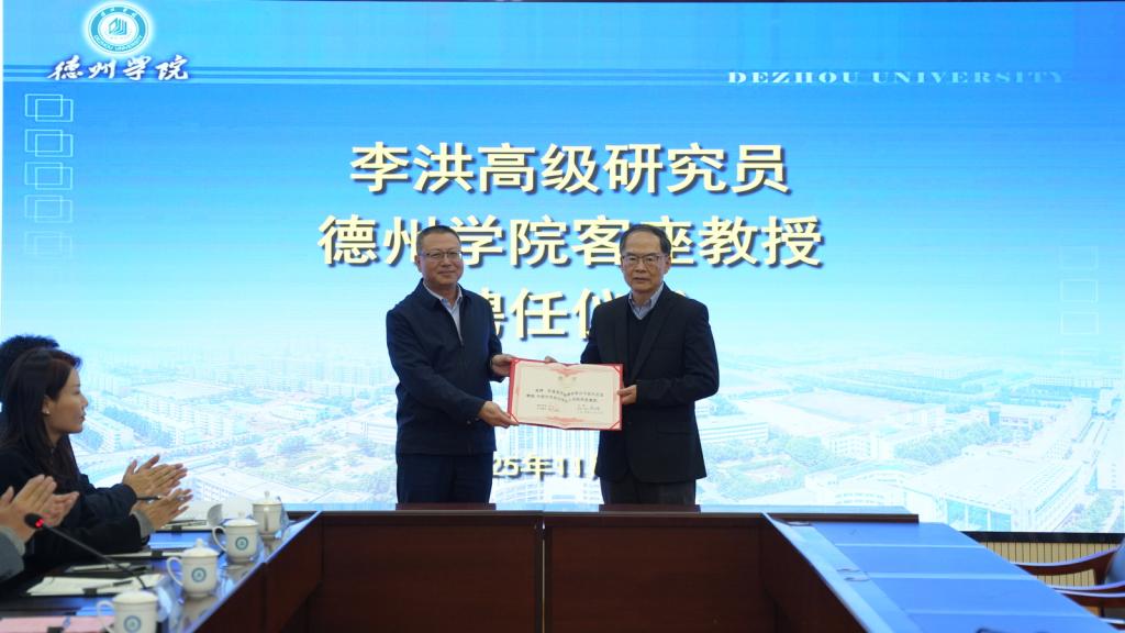 吴君为李洪颁发“tyc122cc太阳成集团客座教授”聘书。