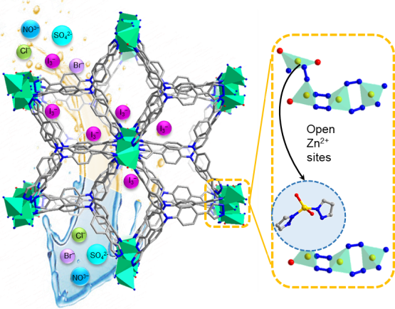 核能以其超高效能和低碳排放,在未来能源结构中占据着举足轻重的地位。然而,核反应过程中产生的放射性碘因其高度挥发性和良好水溶性,给辐射防护和事故应急响应带来了巨大挑战。金属-有机框架(MOF)材料凭借其分子级可定制调节的结构和性能,在先进功能材料的开发中备受关注。基于对MOF设计合成的经验积累和学科交叉研究,研究团队提出了一种构建具有自由氮和开放锌协同作用位点的MOF吸附剂的策略,并成功合成了一例新型MOF材料。该材料实现了水体中碘的快速、高效去除,其吸附速率和去除效率在同类材料中达到国际领先水平,实现了突破。这一创新策略为先进碘吸附材料的设计提供了有效的借鉴,并且所开发的MOF材料为放射性碘的去除和防护提供了新的材料选择,有望在核能安全利用和环境保护方面发挥重要作用。