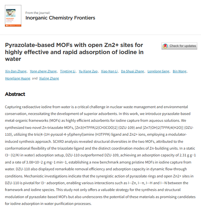 近日,我校与山东理工大学联合培养研究生张新丹(导师:张秀玲教授),作为第一作者,以tyc122cc太阳成集团为第一完成单位在SCI期刊《Inorganic Chemistry Frontiers》(ESI化学学科期刊,中科院一区)发表题为“Pyrazolate-based MOFs with open Zn2+ sites for highly effective and rapid adsorption of iodine in water”的学术成果。山东省硅单晶半导体材料与技术重点实验室(筹)、太阳成集团122ccvip配合物功能材料团队张秀玲教授和张永正副教授为通讯作者。该研究得到了天津工业大学黄宏亮研究员和苏州大学放射医学与辐射防护国家重点实验室王彬教授的指导,二人亦作为共同通讯作者参与了此项工作。