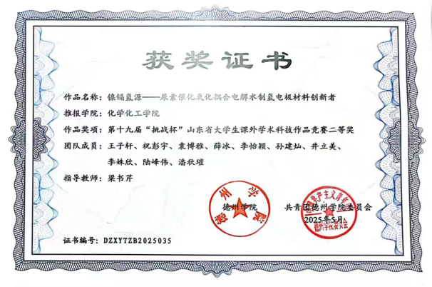 “深耕不辍,科创赋能”。李怡颖积极投身学科竞赛与科研探索,在专业领域不断突破。她征战第十九届“挑战杯”山东省大学生课外学术科技作品竞赛,凭借扎实的专业功底与创新思维斩获省级二等奖;跟随实验室老师深耕电催化方向研究,潜心打磨科研成果,成功参与发表相关专利1篇,用实践诠释对专业的热爱与执着。
